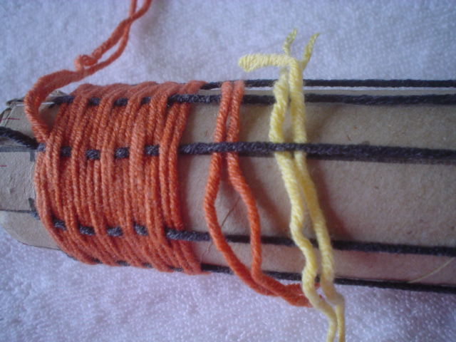 yarn under a warp and put the new yarn next to the one you have finished with, under the